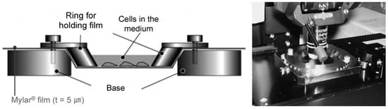 Figure 2. Schematic of the Mylar dish designed for microbeam irradiation (left) and the dish on the irradiation stage (right) in the Photon Factory, KEK, Tsukuba, Japan. This figure is reprinted from Maeda et al. [15] with permission.