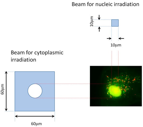To observe the mitochondrial effects separately from the nucleus damage, X-ray microbeams with short-range secondary electrons provide an ideal probe for exposing only the cytoplasm. In some experiments, the cytoplasm has been irradiated selectively using a metal mask to shield the cell nucleus from beam exposure. Using a conventional X-ray source, Ghita et al. [17] investigated DNA damage in human breast cancer cells (MDA-MB-231) and primary fibroblast cells (AG01522) with a low energy X-ray microbeam (278 eV) combined with gold nanoparticles (GNPs) as radiosensitizing agents. They targeted the cell nucleus and cytoplasm selectively, and found that, even when the cytoplasm was targeted, the number of 53BP1 foci, which is an indicator of DNA double-strand break induction, gradually increased during 3 h of incubation for the cancer cells, whereas it decreased for the normal fibroblast cells. The increase or decrease was less than 20%. The areas exposed to the microbeam in the cytoplasm were 5 μm in diameter; hence, part of or most of the mitochondria in the cells maintained their high membrane potential for ATP production. Exposing all the mitochondria to X-ray microbeams is also important. We have investigated the mitochondrial effects by using a deformational synchrotron X-ray microbeam from the Photon Factory (KEK, Japan) (Figure 4) to expose cell nuclei or cytoplasm uniformly. Cytoplasmic irradiation was performed using a 60 × 60 μm2 beam with a 22 μm diameter gold mask to shield the cell nucleus. The particular mitochondrial active sites with high membrane potential were visualized by fluorescent chemical probes. Unexpectedly, preliminary data indicated that the cytoplasmic irradiation did not substantially change the active site area. In contrast, nuclear irradiation promoted an increase in the whole mitochondrial area, suggesting that nuclear DNA damage regulates the mitochondrial dynamics of the cytoplasm.