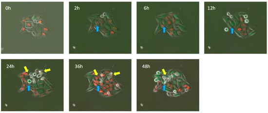 Figure 5. Photographs at specific times extracted from the time-lapse movie of the colony of HeLa cells. The square in the 0 h photograph and blue arrows in the others indicate the targeted cell. Yellow arrows indicate explosive cell death. This figure adapted and modified from Figure 9 in ref. [20] with permission.