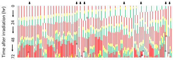 Figure 6. Pedigree Trees obtained from time-lapse movies of bystander HeLa-Fucci cells after several cells in the colony were exposed to 10 Gy. Red and green lines show the cell colors observed and show the G1 and G2 phases, respectively. Cells that exhibited both red and green fluorescence were assumed to be in the S phase and are shown in yellow. The trees are sorted by the duration of the first G1 or G2 phase in descending order. The circle at the end of a tree indicates explosive cell death. Arrows indicate the first cells to show cell death in their progeny. This figure was reprinted from Kaminaga et al. [18] with permission.
