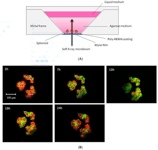 Figure 7. (A) Schematic side view of the layout of the irradiation sample of a HeLa-Fucci spheroid. (B) Images of the spheroids exposed to a 27 Gy X-ray microbeam. The squares in the 2 h photographs show the area exposed to a 40 × 40 μm microbeam. The images were captured at 2, 7, 13, 19, and 24 h after irradiation, as indicated in each picture. These figures were reprinted from Sakamoto et al. [21] with permission.