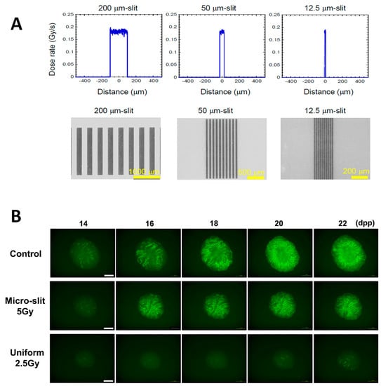 Figure 8. (A) Dose profiles of the microbeams with widths of 200, 50, and 12.5 μm, calculated with PHITS code ver. 2.96 [29] (upper three panels). The beam intensity was flat within the beamwidth. The deviation of the dose was ±6% of the averaged dose. Due to the short range of secondary electrons (1.1 μm maximum) produced by the 5.35 keV X-ray exposure, the doses delivered outside of the irradiated area were negligible (<0.25%). The dose profiles of the 200-, 50-, and 12.5-μm microbeams were experimentally confirmed using Gafchromic XR-RV3 radiochromic film (Ashland Inc., Covington, KY, USA) (lower three images). Scale bars represent 1000, 500, and 200 μm for the 200-, 50-, and 12.5-μm microbeams, respectively. These figures are reprinted from Fukunaga et al. Figure 2c,d in reference [13]. (B) Representative images show Acr-GFP expression changes in single cultures following a dose of 5 Gy from a 200-μm-wide microbeam, 2.5 Gy from uniform X-ray irradiation, and 0 Gy (control), from 12 to 20 dpp. The photographs at 8 dpp are bright-field images. These figures are reprinted from Fukunaga et al. Figure 3a,b in rereference [13].