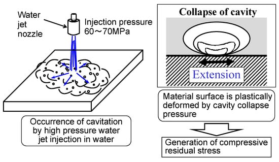 - Enomoto, K.; Hirano, K.; Mochizuki, M.; Kurosawa, K.; Saito, H.; Hayashi, E. Improvement of residual stress on material surface by water jet peening. J. Soc. Mater. Sci. 1996, 45, 734–739. [Google Scholar] [CrossRef]