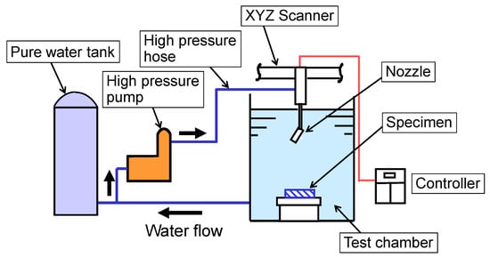 The principles of water jet peeing are shown in Figure 1. The water is pressurized up to about 60–70 MPa using high pressure pump. Highly pressurized water is injected into water through water jet nozzle. The diameter of the nozzle is about 2 mm. By the injection of highly pressurized water into the material, an extremely large number of cavities are generated due to boiling decompression. The distance between nozzle tip and the target material is usually longer than 100 mm and depends on the peening conditions. The depth of water when constructing water jet peeing is 1.5 m and the scanning speed of the nozzle is 0.4 m/s.