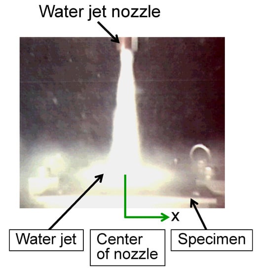 The appearance of water jet peening is shown in Figure 3. Highly pressurized water flowing out of the nozzle rapidly expands due to the boiling decompression, and a large number of cavities are generated. In the figure, the water flowing out from the nozzle and the numerous cavities, appear white. It expands gradually and impinge to the material surface over a wide area.