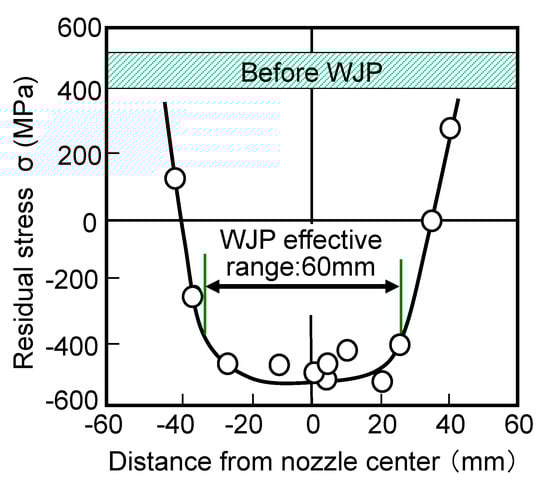 The residual stress distribution on type 304 stainless steel plate surface measured by X-ray diffraction is shown in Figure 4. Before water jet peening the residual stress ranges from 400 to 520 MPa due to grinding. After water jet peening the residual stress is about −500 MPa at the center of peening. A very wide area is covered with the very high compressive residual stress. If assuming the effective residual stress as −400 MPa, the effective area is wider than 60 mm. In the case of laser peening, the effective area is very narrow because of the small diameter of the laser beam—about 1 mm [12]. Thus it is found that the water jet peening effectively reduces tensile residual stress to compressive residual stress.