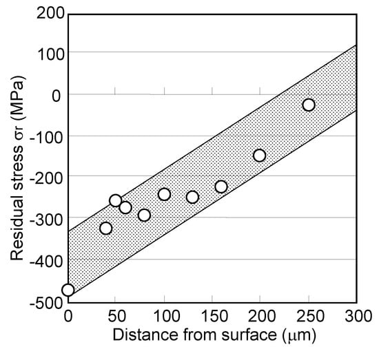 The example of the residual stress distribution near surface induced by water jet peening is shown in Figure 5. The residual stresses were measured by sequential polishing X-ray diffraction method. The residual stress on the surface is about −480 MPa. The compressive residual stress gradually decreased with the distance from the surface. The residual stress becomes almost zero at the depth of about 250 μm and turns to tensile. The compressive residual stress depth is shallower than shot peening [13]. However, the depth which the residual stress turns from compressive to tensile can be deeper than 1 mm by controlling the condition of water jet peening.