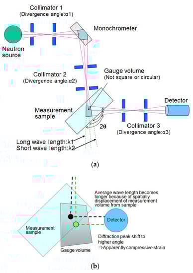 Figure 6 shows principle of pseudo peak shift occurrence in neutron diffraction. The neutron beam generated in a nuclear reactor is transferred to a diffractometer through the guide-like so-called supermirror. At the neutron guide side, the neutron is transmitted through double collimator 1 in which the divergence angle is α1. It is monochromated by a monochromator. There are many types of monochromator. RESA (Residual Stress Analyzer) in JRR-3 of JAEA employs a bent-type monochromator. It consists of nine Si single-crystal plates. Each single crystal is bent to concentrate the neutron beam in the horizontal direction and leans lower or higher, and also turns up and down toward the center of the vertical direction to concentrate the neutron beam in the vertical direction. The monochromated neutron beam is transmitted to the measurement sample through collimator 2 in which the divergence angle is α2. The diffracted neutron beam is transmitted to the detector through collimator 3 in which the divergence angle is α3. The gauge volume is determined by the cross section of incident beam and diffraction beam, and its cross-section is not square or circular. Furthermore, wave length depends on the location in the gauge volume. When the gauge volume deviates from the measurement sample for the residual stress measurement of surface layer, the neutron beam is not diffracted from the volume deviating from the sample. In these complicated gauge volume configurations, the wavelength distribution for the gauge volume and the deviation of neutron beam from the sample gives a complicated diffracted beam profile and leads to the generation of pseudo peak shift. It depends on the neutron beam optics and cannot be simply determined theoretically. Thus the pseudo peak shift has to be evaluated with each experiment.