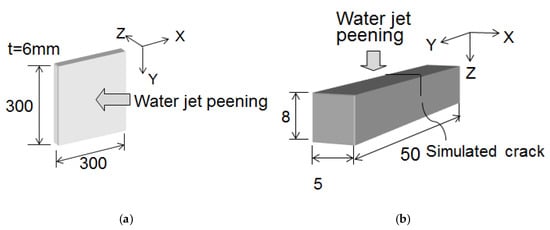 Shapes and dimensions of measured samples are shown in Figure 7. One is a 300 mm square and 6 mm thick plate specimen. Water jet peening is subjected to a normal plate specimen. The other is bar-like specimen. The cross section is 5 mm wide, 8 mm high and 50 mm long. A notch is introduced on the top surface by the electrical discharge machining, simulating SCC (stress corrosion cracking). Its depth is 3 mm. Water jet peening is used on the top surface.