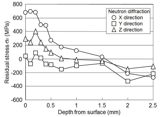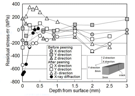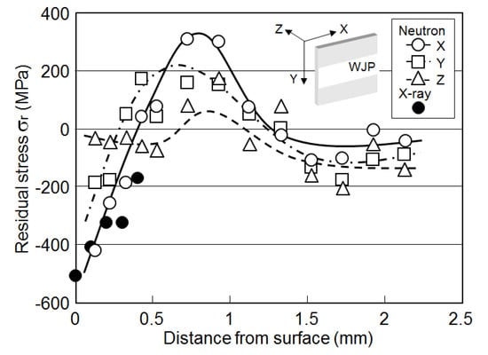 The water jet peening gives almost homogeneous residual stress distribution, as shown in Figure 5, so that the residual stress distribution in x and y directions are almost the same. However, there exists about a 200 MPa difference. At present, since the directionality of the water jet peening process does not exist, the difference of residual stress seems to be involved in the measurement accuracy.