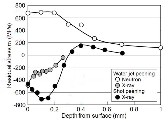 The residual stress distributions in x and y directions were measured by the sequential polishing X-ray diffraction method. The results showed that there was no difference between x and y directions, because the coverage area of the water jet peening as very wide, as shown in Figure 3. The same thing goes for the shot peening. The residual stress distribution in z direction cannot be measured. The comparison of residual stress distributions in water jet peened and shot peened surfaces in x direction are shown in Figure 10. In the figure, open circles reveal the residual stress distribution measured by neutron diffraction in x direction, as shown in Figure 9. Gray circles reveal the residual stress distribution measured by the sequential polishing X-ray diffraction shown in Figure 5. Black circles reveal the residual stress distribution in the shot peened surface layer measured by the sequential polishing X-ray diffraction. It is clear that the residual stress distribution in x direction differs from those measured in shot or water jet peened surface by the sequential polishing X-ray diffraction method.