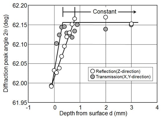 As mentioned in the introduction, when the gauge volume deviates from the sample, a pseudo peak shift occurs and accurate stress distribution cannot be evaluated. Therefore, the pseudo peak shift has to be measured under the same conditions as in the case of actual residual stress measurement using a sample in an unstressed state. The pseud peak shifts obtained are shown in Figure 11. The pseud peak shifts depend on the diffraction conditions. In the figure the peak shifts for the reflection in z direction and the transmission in x and y directions are shown. The pseud peak shifts on the surface is about 61.99 deg. Since the pseud peak shift disappears when the gauge volume is fully involved in the sample, the diffraction peak angle becomes constant. However it depends on the diffraction condition, so that the pseud peak shift for the transmission disappears at shallower depth and the pseud peak shift for the reflection disappears at deeper depth.