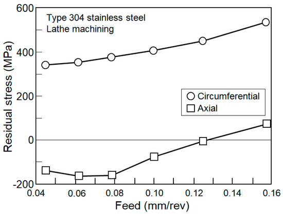 The effect of feed on the residual stress is shown in Figure 4. Feed for every revolution of specimen was changed from 0.045 m/rev to 0.157 mm/rev. The axial residual stress is −130 MPa for the feed of 0.045 mm/rev. It slightly decreases with the feed but gradually increases with the feed. It turns tensile at the feed of 0.135 mm/rev and takes the maximum value of 80 MPa for the feed of 0.157 mm/rev. The circumferential residual stress is tensile, and it takes 340 MPa for the feed of 0.045 mm/rev. It gradually increases with the feed and takes the maximum value of 520 MPa for the feed of 0.157 mm/rev.