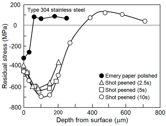 Residual stress distribution in the shot peened type 304 stainless steel plate is shown in Figure 11. Shot peened time is 2.5, 5, and 10 s. For reference, the residual stress distribution in emery paper polished steel is shown in the Figure 9. The residual stresses induced by the shot peening range −400 MPa and −460 MPa. They decrease with the depth, take the maximum values at about 100 µm, and gradually increase. For balancing with the compressive residual stress, the tensile residual stress is induced for deeper positions.