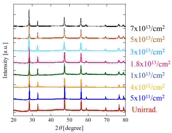 Figure 1. Widely scanned XRD spectra for unirradiated and irradiated CeO2 specimens. Xe ion fluences are shown at the right side of the figure.