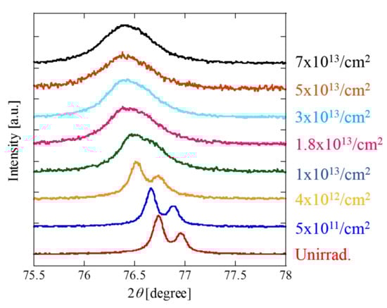 If the change in properties of a target material does not depend on the number of the track impact, the macroscopic change in the property should be simply proportional to Equation (4). Many papers have reported that, when a target material is amorphized inside the ion-track, the macroscopic change in target material properties is expressed by Equation (4), which is the Poisson law, because the amorphous state remains unchanged even by the following ion impacts [,,]. In such cases, by fitting the experimental results using the Poisson law, the area of each ion-track, S, and the track diameter can be determined.