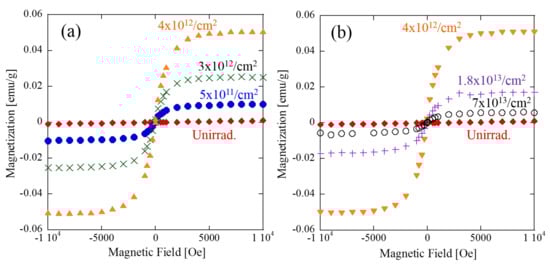 Since the calculation using the SRIM code [] shows that the range of 200 MeV Xe ion in CeO2 is about 12 μm, the effects of the irradiation appear only near the surface of the specimens. Since the penetration depth of Cu Kα X-ray in CeO2 (about 4 μm) is much smaller than the ion range, the XRD spectra reflect the lattice structure only for the irradiated surface region. A SQUID magnetometer, however, measures the total magnetic moment not only from the irradiated surface region but also from the unirradiated region. To obtain the magnetization (emu/g) induced by the irradiation, we removed the magnetic moment for the unirradiated region from the measured magnetic moment, and divided the magnetic moment for the irradiated region by its mass. The magnetic moment from the unirradiated part of the specimens can be estimated from the SQUID result for the specimen before the irradiation. The values of the irradiation-induced magnetization (emu/g) obtained through the process described above are plotted as a function of an external magnetic field in Figure 4a (for lower fluences) and Figure 4b (for higher fluences).