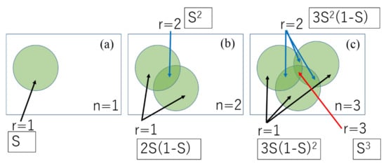To explain the relationship between the probability of the ion-track overlapping and the probability distribution function, we will first use the binomial distribution function. The schematic drawing of the ion-track overlapping is shown in Figure 6. This drawing is similar to the figure in Reference []. The area of each rectangle is assumed to be 1 cm2. In the figure, the value of n is the number of ion-tracks/cm2, and r means the number of the impact by the ion-tracks. Figure 6a shows the production of a single ion track with the cross section of S (the number of ion-tracks is n = 1/cm2, and the number of the impact is r = 1). For the present case, only inside the area of S, the changes in lattice constant and a magnetic state are induced. Figure 6b shows the overlapping of ion-tracks by the production of a second ion-track (the total number of ion-tracks is n = 2/cm2). The area for the double impact (r = 2), which corresponds to the probability of the track overlapping, is S2, and the total area of non-overlapped ion-tracks (r = 1) is 2S (1−S). When a third ion-track is produced (n = 3), as is shown in Figure 6c, the areas of triple impact (r = 3), double impact (r = 2), and single impact (r = 1) are S3, 3S2 (1−S), and 3S (1−S)2, respectively. For a given number of ion-tracks, n, the total area for the r-times impact (r <= n), A(n,r), is described by the following binomial distribution function.