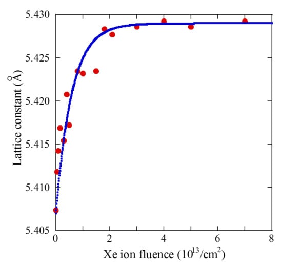Figure 7 shows that the experimental result on the ion fluence dependence of lattice constant, L(ϕ), can be fitted well by using the following function.