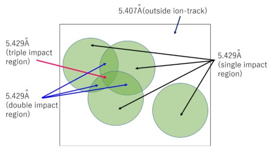 where L0 is the lattice constant outside the ion-tracks, L1 is the lattice constant inside the ion-track, S is the cross section of each ion track, and ϕ is the ion fluence. The value of L0 is the same as the lattice constant for the un-irradiated specimen (5.407 Å). As best fitting parameters, the values of L1 = 5.429 Å and S = 1.7 × 10−13/cm2 have been used. The good fitting of the experimental result by using the Poisson law means that the lattice constant inside the ion-track is not affected by overlapping ion-tracks. Figure 8 explains this situation. The lattice constant for the double impact region, triple impact region, and more is the same as that for the single impact region. This is similar to the case of the amorphous tracks. From the following equation,