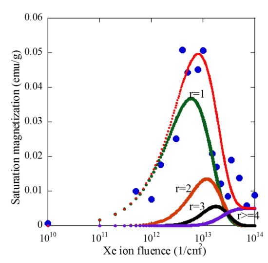 In this case, the symbol, n, is replaced with ϕ, which is a common symbol for the ion fluence. Equation (7e) can be deduced by using Equation (3). The value, which is measured as the irradiation-induced saturation magnetization, M(ϕ), is, therefore, given as: