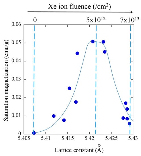 Lastly, we will discuss the relationship between the lattice structure and the magnetic state inside the ion-tracks. Figure 11 shows the correlation of the lattice constant with the FWHM (full width half maximum) of the (331) XRD peaks. The upper axis of the figure represents the ion fluence. The value of FWHM corresponds to the degree of lattice disordering. Below the ion fluence of 5 × 1012/cm2, the lattice constant increases with increasing the ion fluence. However, the value of FWHM rarely changes. Above the ion fluence of 5 × 1012/cm2, the lattice constant still increases and tends to be saturated (see also Figure 3), and the value of FWHM rapidly increases with increasing the ion fluence (and also the lattice constant). Figure 12 shows that, below the ion fluence of 5 × 1012/cm2, the saturation magnetization rises when increasing the lattice constant and ion fluence. However, above the ion fluence of 5 × 1012/cm2, the saturation magnetization decreases with increasing the lattice constant and the ion fluence (see Figure 5). Figure 11 and Figure 12 clearly show that the increase in irradiation-induced magnetization for lower ion fluences is correlated with the increase in the lattice constant. The decrease in irradiation-induced magnetization for higher ion fluences is attributed to the lattice disordering.