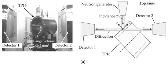 As illustrated in Figure 4, the internal residual stress distributing along the thickness direction was measured by neutron diffraction at the center of the cylinder [13]. Figure 5 shows the setup image and optical system of neutron diffraction measurement of hollow cylinder specimen T16 [13]. For triaxial stress analysis, the measurements were conducted on the cylinder with the axial direction (a) parallel and (b) perpendicular to the stage surface, respectively. The gauge volume of measurement was set as 2 mm × 2 mm × 2 mm when the cylinder axial direction is parallel to the stage surface. In the case of the measurement in Figure 5b, considering the diffraction intensity would decrease remarkably after the neutron beam had penetrated the walls of cylinder twice, the gauge volume was set as large as 2 mm (h direction) × 2 mm (r direction) × 10 mm (z direction) so that higher diffraction intensity could be acquired. The lattice constant was also evaluated by Rietveld refinement. Two specimens of T16, designated as A and B, were employed for investigating data scatter.