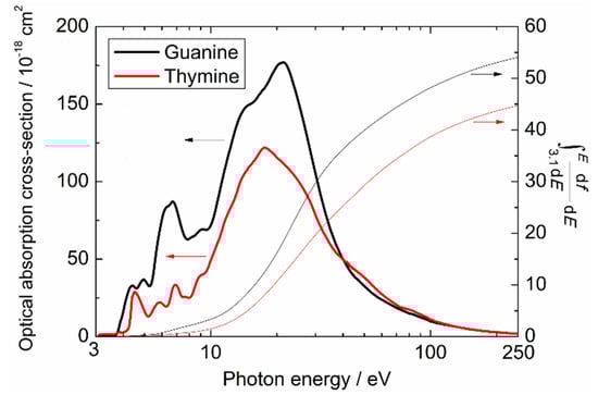 The values of ftotal in the energy range from 3.1 to 250 eV of thymine and guanine were 44.7 and 54.0, respectively (Figure 1), and agreed well with the values of Ne (48 for thymine and 56 for guanine) within experimental and analytical errors []. Therefore, it was concluded that the values of the optical absorption cross-section determined in the present work are reasonable.