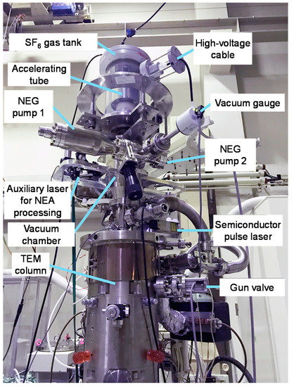 Figure 2 shows the appearance of a pulse TEM equipped with the developed photocathode electron gun. The pulsed electron gun consists of an ultrahigh vacuum chamber capable of NEA surface processing, an acceleration tube, an ion pump, two non-evaporable getter (NEG) pumps, a Cs vapor deposition source for NEA surface processing, a semiconductor pulse laser for pulse electron generation, and an auxiliary laser for photocurrent measurement during NEA surface processing. The accelerating voltage is 50 kV, and the ultimate vacuum of the chamber is ~5 × 10−9 Pa. The wavelength of the semiconductor pulse laser for pulse electron generation is 404 nm, and it is possible to generate pulses from continuous wave (CW) to nanoseconds. The pulse electron gun was assembled by installing it to the Hitachi HF-2000 TEM (Hitachinaka, Ibaraki, Japanc) from which the cold field-emission electron gun and the acceleration tube were removed.