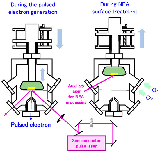 Figure 3 shows schematic illustrations of the operation. The cathode and acceleration tube have a structure that slides up and down. During the pulsed electron generation, the cathode and the anode are in a close state, and the pulsed electrons excited by the semiconductor pulse laser are introduced into the TEM column. On the other hand, during NEA surface treatment, the cathode moves to the upper part of the chamber, and the cathode substrate is heated at approximately 550 °C in an O2 atmosphere of about 10−6 Pa and under Cs vapor deposition. At the same time, the activation process is performed while monitoring the state with the photocurrent generated by the auxiliary laser excitation.