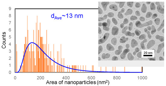 In order to evaluate the performance of the apparatus, the exposure time required for pulse imaging was measured. Figure 4 shows a bright-field image that was taken by conventional TEM with a thermal emitter and size dispersion of Au nanoparticles on an amorphous carbon film used for pulse imaging as a standard sample. The size distribution was fitted by the lognormal distribution function, and the average particle size was approximately 13 nm.