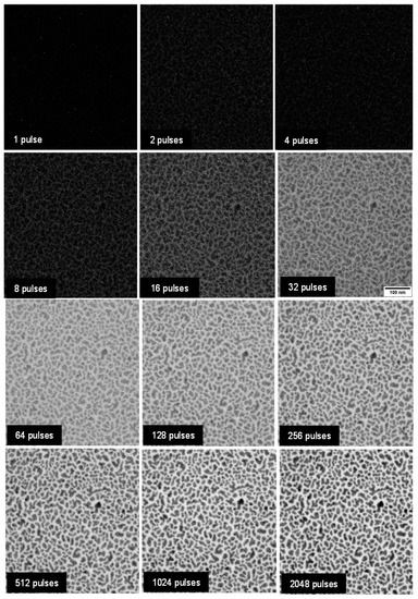 Figure 5 shows the results of the pulse imaging of Au nanoparticles mentioned above by bright-field images. The contrast becomes clearer as the number of integrated pulses increases. It is evident that the image can be identified at about 4–8 pulses under the conditions. A factor in which laser frequency affects image quality is the amount of specimen drift within the total exposure time. If the total exposure time is shortened, the effect of the specimen drift will be reduced, which will lead to an improvement in image quality. In Figure 5, even with a total of 2048 pulses, the total exposure time is about 0.2 s, and even if an interval of 100 ms is included, it is 0.4 s, and the effect of the specimen drift is very small.