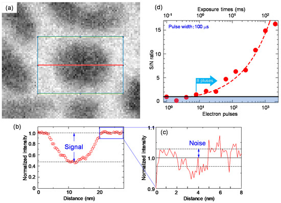 An example of the contrast profile of Au nanoparticles on an amorphous carbon support film. (a) A bright-field image, (b) the contrast change of the part indicated by a red line in Au nanoparticles, (c) an enlargement of the contrast in the amorphous carbon support film, (d) S/N ratio as a function of the number of pulses (exposure time).