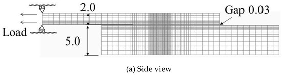 Figure 7 shows the FEM analysis under a tensile loading of about 70 kgf. An extremely high tensile and compressive strain was observed in the limited part near the interface of the plates. In particular, a strong tensile strain of about 3000 × 10−6 was obtained at the edge of the interface. This calculated value was qualitatively consistent with the experimental results in Figure 5f.