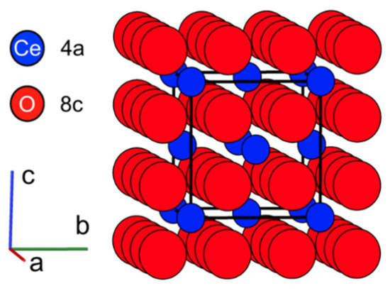 Under ambient conditions, cerium dioxide (CeO2) adopts the fluorite structure (space group Fm-3m), common to a variety of dioxides such as UO2, ThO2, PuO2, and doped ZrO2 [1,2]. In this phase, Ce cations arrange in a face-centered cubic array on 4a Wyckoff sites with a simple cubic substructure of oxygen anions occupying 8c sites (Figure 1). The flexibility of cerium’s electronic structure allows for extensive transitions between the nominal 4f0–Ce4+ oxidation state and a 4f1–Ce3+ state without loss of the long-range fluorite structure. This transition is so prevalent over a wide range of conditions that materials containing cerium (including oxides) with monovalent Ce4+ cations are difficult to fabricate [3].