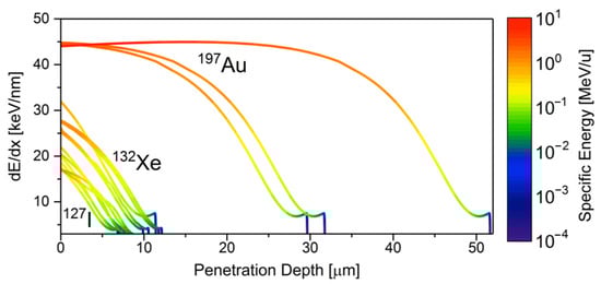 The effects of SHI energy deposition parameters on the induced structural modifications in CeO2 has been investigated over a broad dE/dx range between 15 and 45 keV/nm, as shown in Figure 2. Ions of specific energy ranging from 0.5–30 MeV/u (with u being the number of nucleons) and species ranging from 127I–238U have been utilized in these experiments [32,33,34,35,36,37,38,39,40,41,42,43,44,45,46,47,48,49,50,51,52,53,54,55,56]. The strong dependence of the energy loss on the ion energy leads to continuous change in dE/dx along the ion’s penetration path in the material (Figure 2), which must be considered for characterization in order to accurately relate irradiation effects to the specific dE/dx within the volume probed by a particular characterization technique [57].