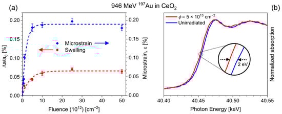 Figure 3. Structural and chemical changes in CeO2 after irradiation with 946 MeV 197Au ions, as adapted from Tracy et al. [46]. (a) Relative change in unit cell parameter (red) and heterogeneous microstrain (blue) based on X-ray diffraction measurements as a function of ion fluence and (b) corresponding X-ray absorption spectroscopy measurements of an unirradiated (blue) sample and after irradiation to a fluence of 5 × 1013 ions/cm2 (red).