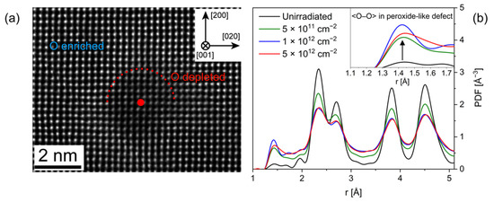 A recent HRTEM investigation by Takaki et al. [42] provided detailed insight into the size and damage morphology of 200 MeV 132Xe ion tracks in CeO2. This provides the basis for more fundamental understanding of the defect mechanisms leading to the formation of SHI tracks. A core-shell track morphology was observed, wherein the interior of the track is oxygen deficient and the annular shell oxygen rich (Figure 4a). This suggests that SHI traversal and associated energy deposition causes the radial expulsion of oxygen from the ion path region. Since cerium’s electronic structure is flexible, the oxygen vacancies within a core region are stabilized by charge compensation from partial cation reduction (Ce4+ to Ce3+). These measurements also showed that oxygen anions are displaced up to 17 nm from the center of the ion track [42]. Neutron total scattering measurements of CeO2 irradiated with 2000 MeV 197Au ions showed that a fraction of the displaced oxygen atoms form peroxide-like defect clusters (Figure 4b) [50]. These defect clusters may act as a structural and chemical compensation mechanism to balance the oxygen interstitials with their counterpart oxygen vacancies stabilized through cation reduction.