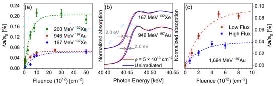 Figure 5. (a) Relative change in unit cell parameter based on XRD pattern analysis as a function of fluence for CeO2 irradiated with 200 MeV 132Xe (green, dE/dx = 27 keV/nm), 946 MeV 197Au (red, dE/dx = 44 keV/nm), and 167 MeV 132Xe (blue, dE/dx = 27 keV/nm). (b) X-ray absorption spectra of the cerium K-edge in CeO2 before irradiation (blue) and after irradiation to a fluence of 5 × 1013 ions/cm2 (red) with 167 MeV 132Xe (top) and 946 MeV 197Au (bottom). (c) Relative change in the unit cell parameter, determined by XRD pattern analysis, for CeO2 irradiated with 1694 MeV 197Au ions at ion fluxes of ~109 ions/cm2/s (red) and ~1010 ions/cm2/s (blue). Dashed lines in (a,b) are fits based on a single-impact model. These data are based on work published by Tracy et al. [46] (a,b) and unpublished work (a,c).
