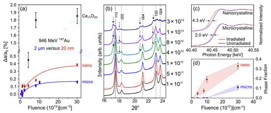 Figure 6. (a) Fluence-dependent change in unit cell parameter based on XRD pattern analysis for microcrystalline CeO2 (blue, grain size = 2 μm), nanocrystalline CeO2 (red, grain size = 20 nm), and the Ce11O20 phase produced in nanocrystalline samples (black), all relative to the unit cell parameter of unirradiated CeO2. (b) X-ray diffraction patterns of irradiated nanocrystalline CeO2 as a function of fluence, displaying the emergence of new peaks corresponding to the Ce11O20 phase, as indicated with arrows. (c) X-ray absorption spectra of the cerium K-edge in CeO2 before irradiation (blue) and after irradiation to a fluence of 5 × 1013 ions/cm2 (red) in nanocrystalline (top) and microcrystalline (bottom) samples. (d) Phase fraction of Ce11O20 relative to the fluorite phase as a function of ion fluence for microcrystalline (blue) and nanocrystalline (red) CeO2. Irradiation was performed with 946 MeV Au ions. These data were adapted from Cureton et al. [52] (a,b,d) and Tracy et al. [46] (c).