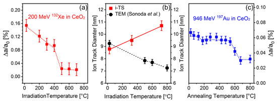 Figure 7. (a) Change in unit cell parameter from XRD pattern analysis as a function of irradiation temperature for CeO2 irradiated with 200 MeV 132Xe ions, relative to unirradiated reference samples heated under identical conditions [54]. (b) Ion track diameters determined by inelastic thermal-spike calculations [54] (red) and measured based on TEM images [32,33] (black) as a function of irradiation temperature. (c) Effect of thermal annealing on the relative change in unit cell parameter in CeO2 previously irradiated with 946 MeV 197Au ions [45]. Dashed and solid lines are to guide the eye. This figure was adapted from (a,b) Cureton et al. [54], (b) Sonoda et al. [32,33], and (c) Palomares et al. [45].