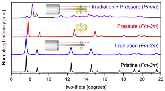The high-pressure response of CeO2, in the absence of irradiation, is characterized by a sluggish phase transformation above ~30 GPa to the PbCl2-type cotunnite phase [74,75]. This transformation is typical of fluorite-structured materials, and in ceria it reaches completion at ~50 GPa. When irradiation is conducted at high pressure, this transformation is modified. Figure 8 illustrates the effects of separate and coupled pressure and irradiation, revealing that pressure significantly modifies the response of CeO2 to SHI irradiation and vice versa.