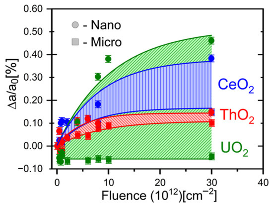 Figure 9. Relative change in unit cell parameter from XRD measurements as a function of fluence for microcrystalline (squares) and nanocrystalline (circles) UO2 (green), ThO2 (red), and CeO2 (blue) irradiated with 946 MeV 197Au ions. The shading displays the variation in irradiation-induced unit cell parameter changes between microcrystalline (2 μm) and nanocrystalline (20 nm) samples for each material. Adapted from Cureton et al. [52].