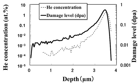 A damage profile and a He-ion range in vanadium were plotted in Figure 1 as calculated by using the SRIM-2013 code, which calculates the transport and energy loss of ions in matter [16]. The displacement threshold energy was 40 eV.