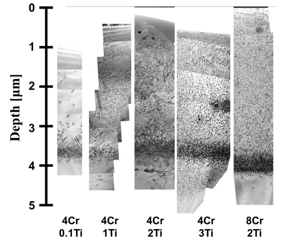 Figure 2. Cross-sectional bright-field TEM images of He-irradiated V–Cr–Ti(h) alloys at 500 °C from the irradiation surface to the peak damage area (~3.8 μm).