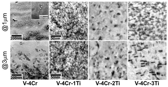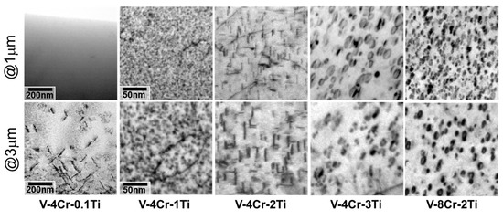 Figure 3. Bright-field TEM images of He-irradiated V–Cr–Ti(h) alloys at 500 °C. Upper parts show high-magnification images at a 1 μm depth and lower parts show images at a 3 m depth. Note that the left photo has a different magnification than the other ones.