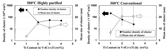 Figure 5. Number density and mean size of defect clusters in V–Cr–Ti alloys irradiated at 500 °C as a function of Ti content in V–4Cr–xTi. Left plot for V–Cr–Ti(h) alloys with highly purified impurity level and right plot for V–Cr–Ti alloys with a conventional impurity level.