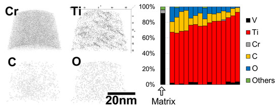 A data at the left end in a histogram of Figure 6 shows the component ratio of alloy matrix, and the others show the component ratio inside Ti aggregates. The main elemental Ti aggregates were composed of Ti with a few interstitial impurities of C and O. The average ratio of each element in the Ti aggregate was obtained as V:Ti:Cr:O:C = 1:77:0:13:9. Metallic elements were only occupied by elemental Ti in the neutron-irradiated V–4Cr–4Ti alloys at 350 °C and 450 °C [25,26], which are in agreement with the result of this work. The Ti distribution in the Ti aggregates was likely to be independent of the oxygen distribution in the specimen, but the Ti aggregate contained a certain amount of interstitial impurities, such as oxygen and carbon.