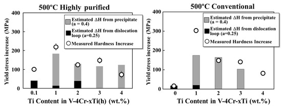 Figure 8 presents a plot of the balance of the increase in yield stress in the V–Cr–Ti(h) and V–Cr–Ti alloy after ion irradiation. The measured irradiation hardening data and the estimated yield stress increases are shown by open circles and a bar chart, respectively. A gray and black bar chart shows hardening contribution of Ti(CON) precipitates and dislocation loops, respectively. Most of irradiation hardening was contributed to by the Ti(CON) precipitate, as shown in Figure 8. The correlation between the measured and estimated yield stress increased in the V–Cr–Ti(h) alloys with a highly purified impurity level, thereby showing good agreement. Additionally, Ti(CON) precipitates were found to be important for the irradiation hardening behavior in the V–Cr–Ti(h) alloys. The measured irradiation hardening was significantly larger than the estimated yield stress increase in the V–4Cr–1Ti alloy with a conventional impurity level, but the V–4Cr–2Ti and 3Ti alloys showed a good agreement between the measured and estimated yield stress increase. The difference in yield stress increase between the measured and estimated yield stress increase is caused by Ti aggregates combining with oxygen impurities in the V–4Cr–1Ti alloy.