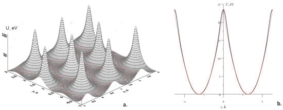 To perform correct calculations, for both cases of charged particles channeling in crystals, the approximated expressions of the continuous potential should be modified, taking into account the thermal vibrations of crystal atoms. Thus, the updated Formulas (4) and (5), i.e., thermally averaged continuous potentials, depend on the amplitude of thermal vibrations of atoms, which is, in turn, a function of Debay temperature (see in [93,94]). Moreover, precise expressions for the continuous potentials of a crystal count the contribution of a sufficient number of neighbour atomic planes or axes characterised by equivalent Miller index (Figure 2) [95]. A set of continuous potentials for selected crystal orientation forms a well emphasised periodic potential, which consists of successfully repeated potential wells, the minima of which are situated either at the axis (plane) positions or between the neighbour axes (planes). The positions of the potential well extremes are determined by the channeled particle charge. Due to this feature, the opposite charged particles become differently redistributed in the transverse plane. This is why negatively charged particles, moving in the vicinity of atomic axes or planes, suffer much stronger scattering by crystal atoms in comparison with positively charged particles, which are mostly distant from the axes or planes. Obviously, the potential wells for a selected particle charge become the potential barriers for the particles of an opposite charge.